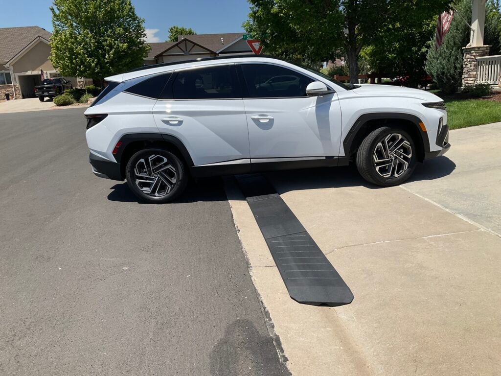 For most situations, a curb ramp – like the BRIDJIT ramp set – is the simplest, most affordable fix. A curb ramp creates a smoother transition between the street and your driveway, reducing the angle so your car glides over instead of scraping.